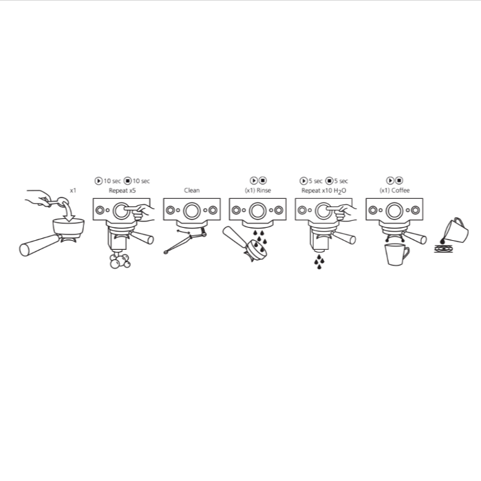 - For daily cleaning add 1 level scoop of Espresso Clean® into the group handle and insert as if brewing espresso. If the machine is cleaned less often, use 2 level scoops.