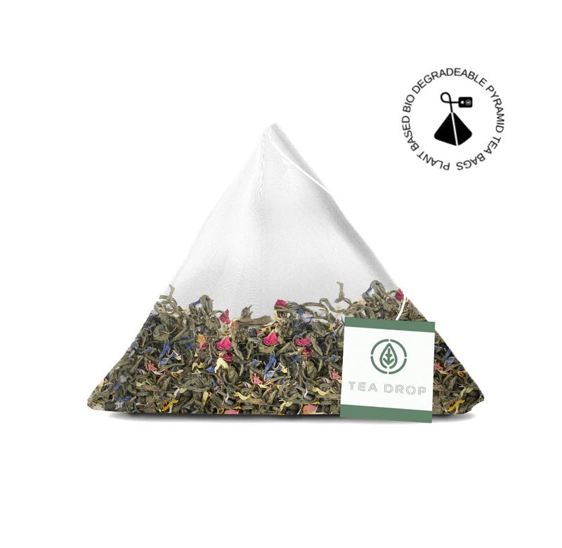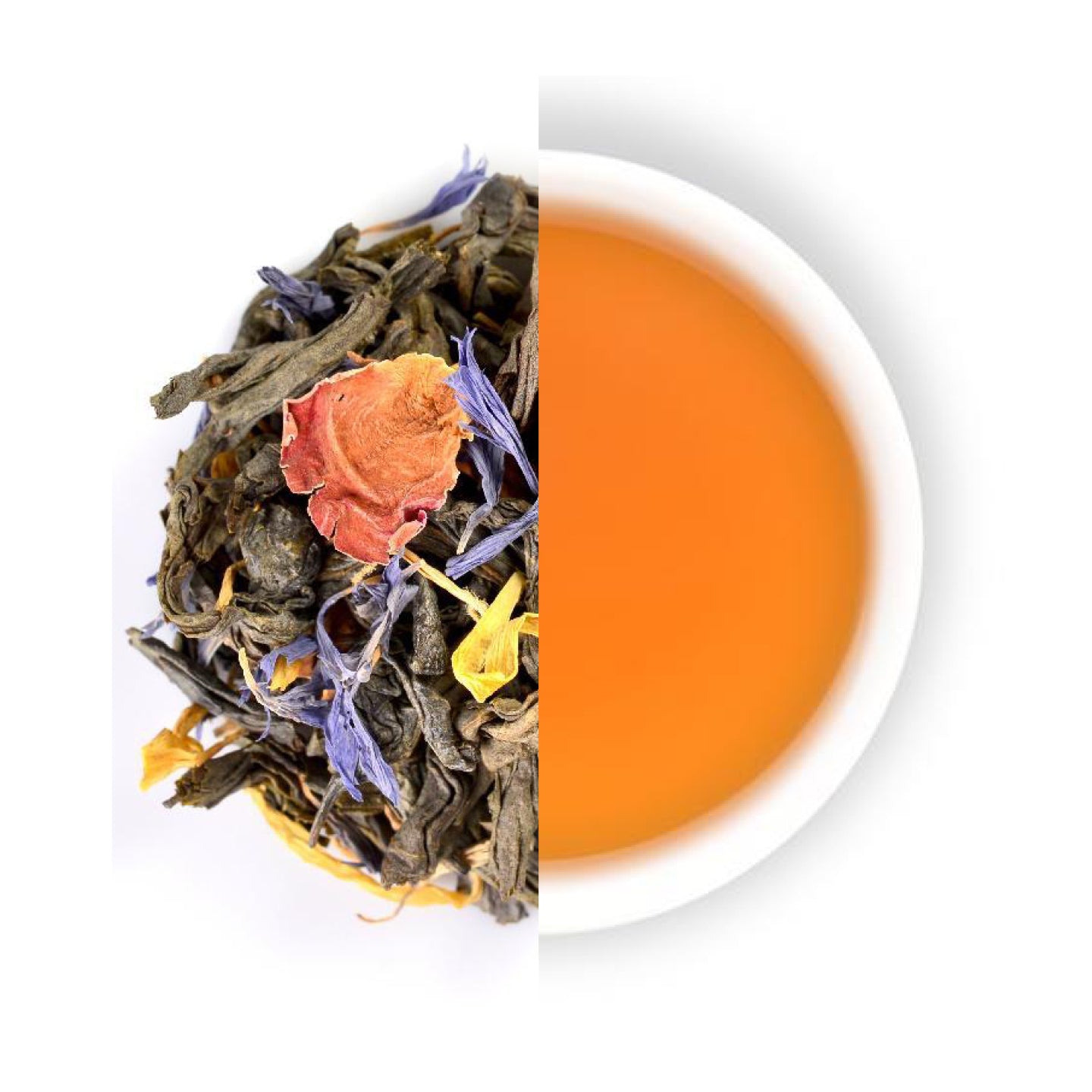 Green tea, rose petals, corn flowers, marigold petals & lemon peel.